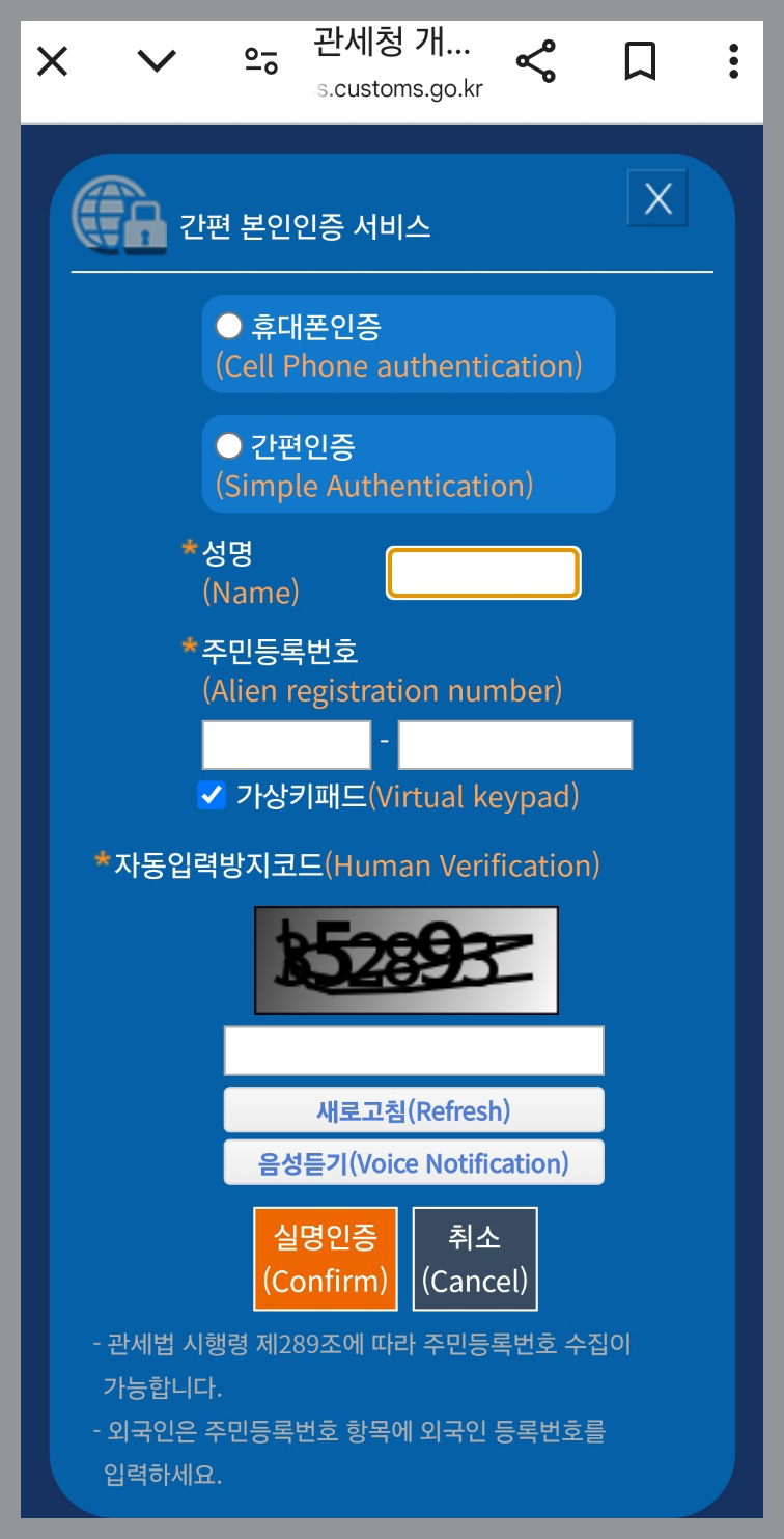 *** 관세청 개인통관고유부호 사이트 접속 후 순서대로 입력하시면 됩니다.***