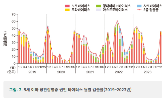 노로바이러스는 세균이나 바이러스 등의 병원체에 의한 구토와 설사를 주 증상으로 하는 감염병으로, 현재 국내에서 장관감염증은 제4급 법정감염병으로 지정되어 관리되고 있다.