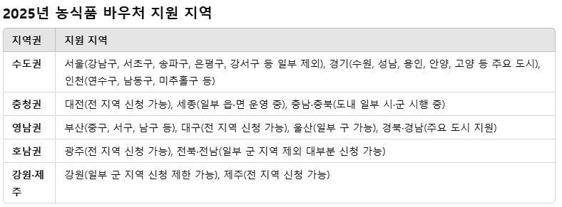 ✅ 신청 전 반드시 지역별 신청 조건을 확인하세요! 농식품 바우처 누리집 또는 거주지 주민센터에서 최신 정보를 확인할 수 있습니다.