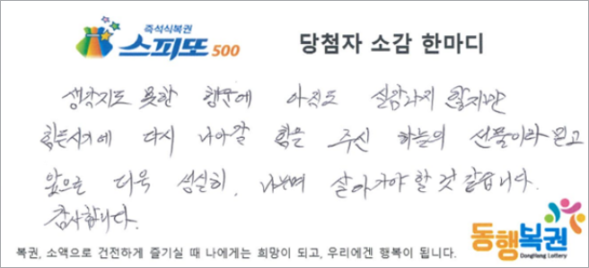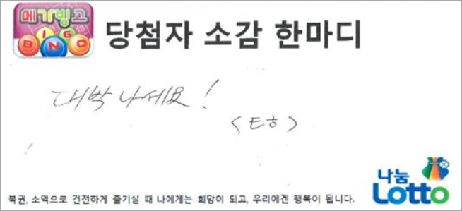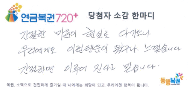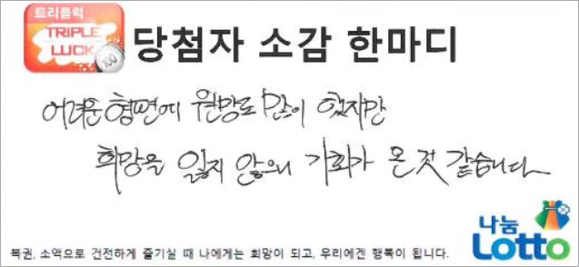 다음은 지금까지 당첨된분들의 짤막한 당선 소감을 적은 것들입니다. 잘보시고 기운받아서 당첨에 행운을 갖으시기 바랍니다. 이제 당신이 소감을 적을 차례입니다!!