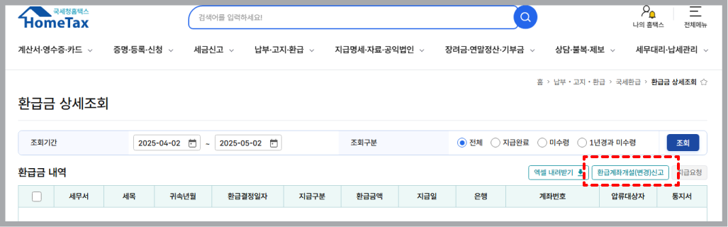 ▶ 홈택스 로그인 → My홈택스(환급상세조회) → 환급계좌 관리 → 계좌 등록/변경