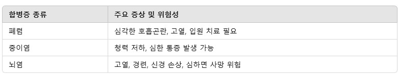 - 폐렴, 중이염, 심한 경우 뇌염 등 치명적 합병증 발생 가능