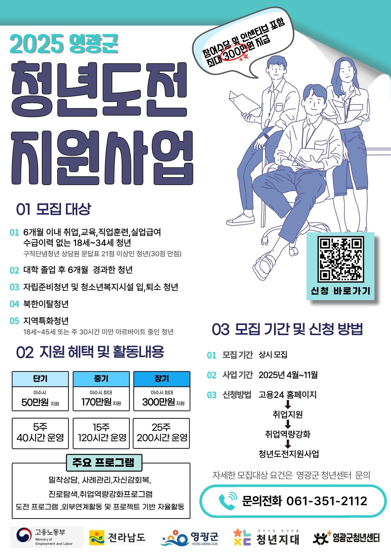 - 참여 시 매주 생활지원금 지급 (총 최대 300만 원 내외)